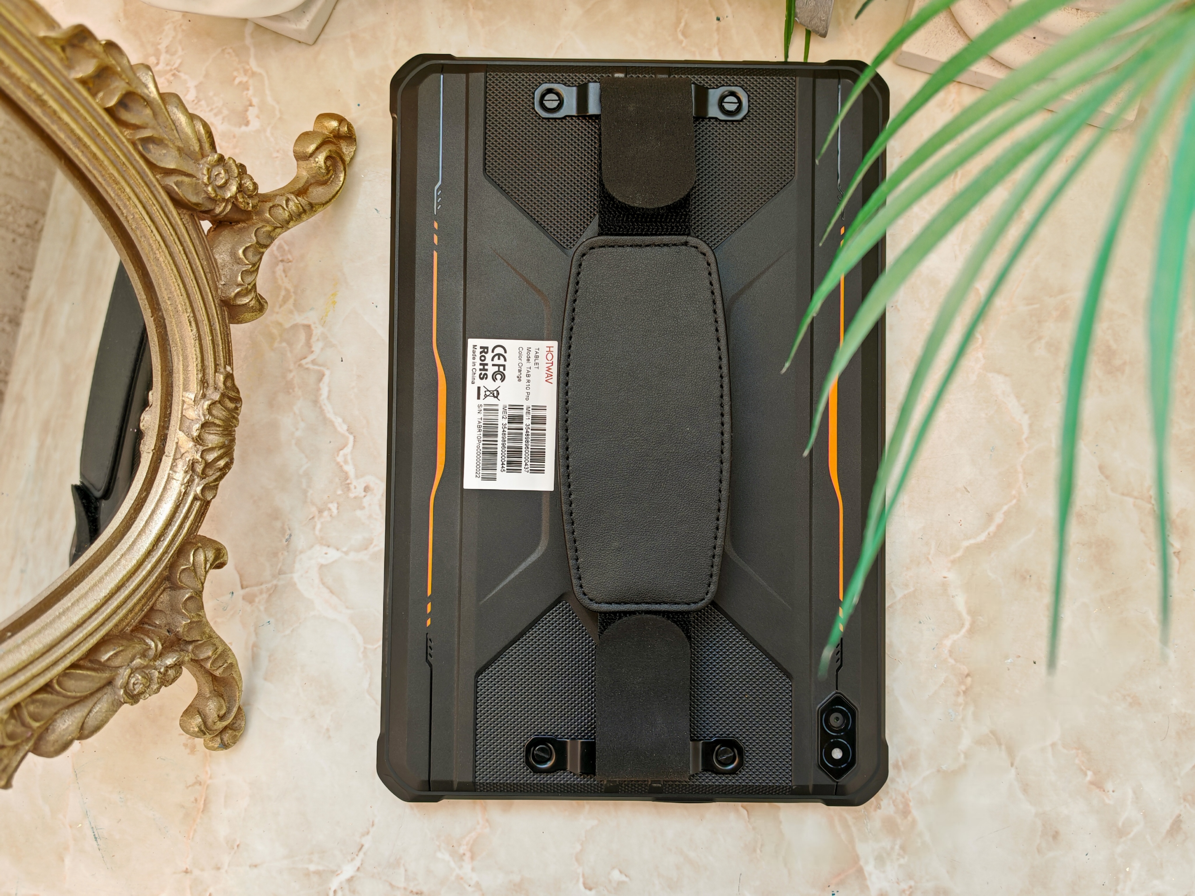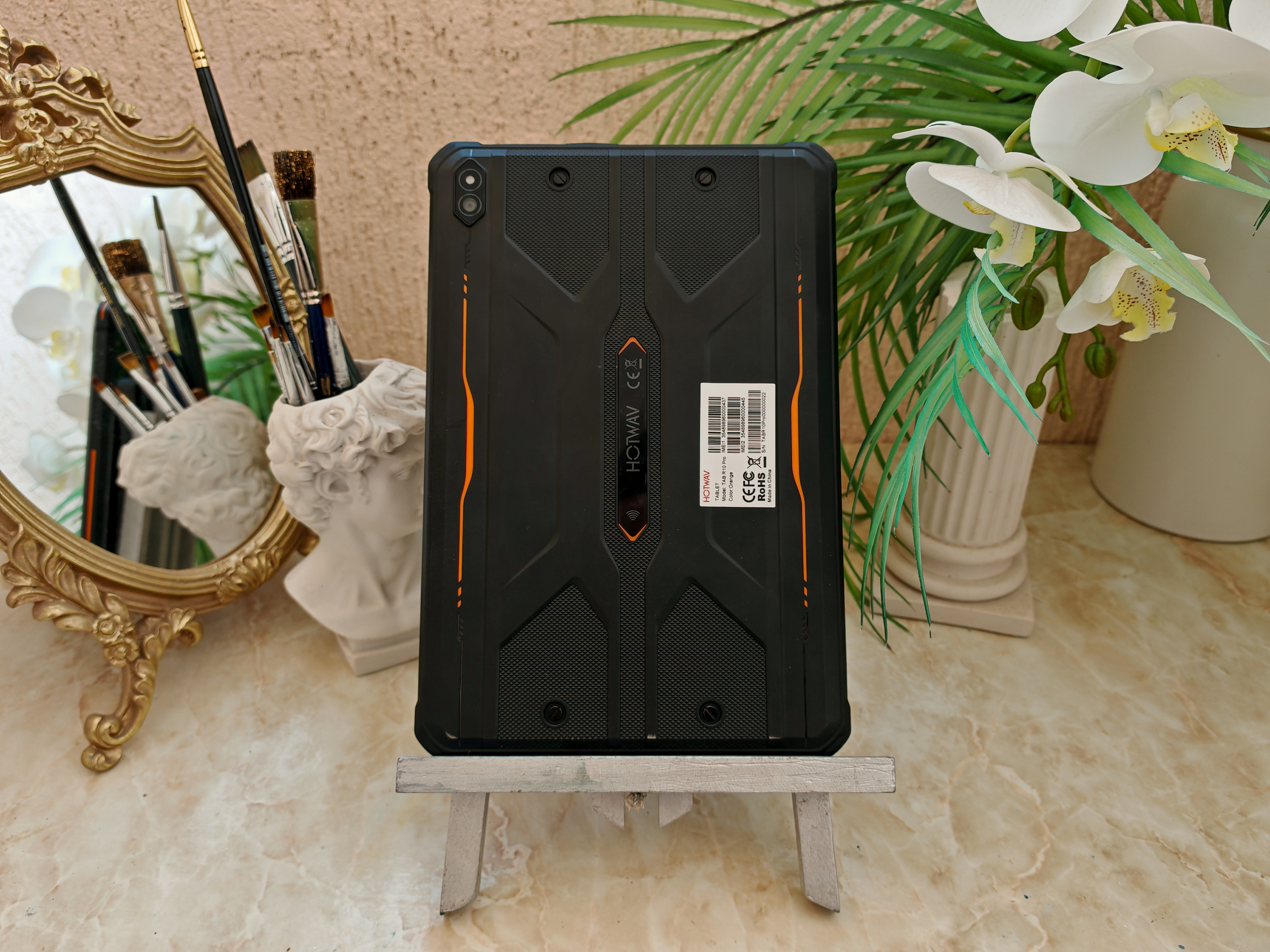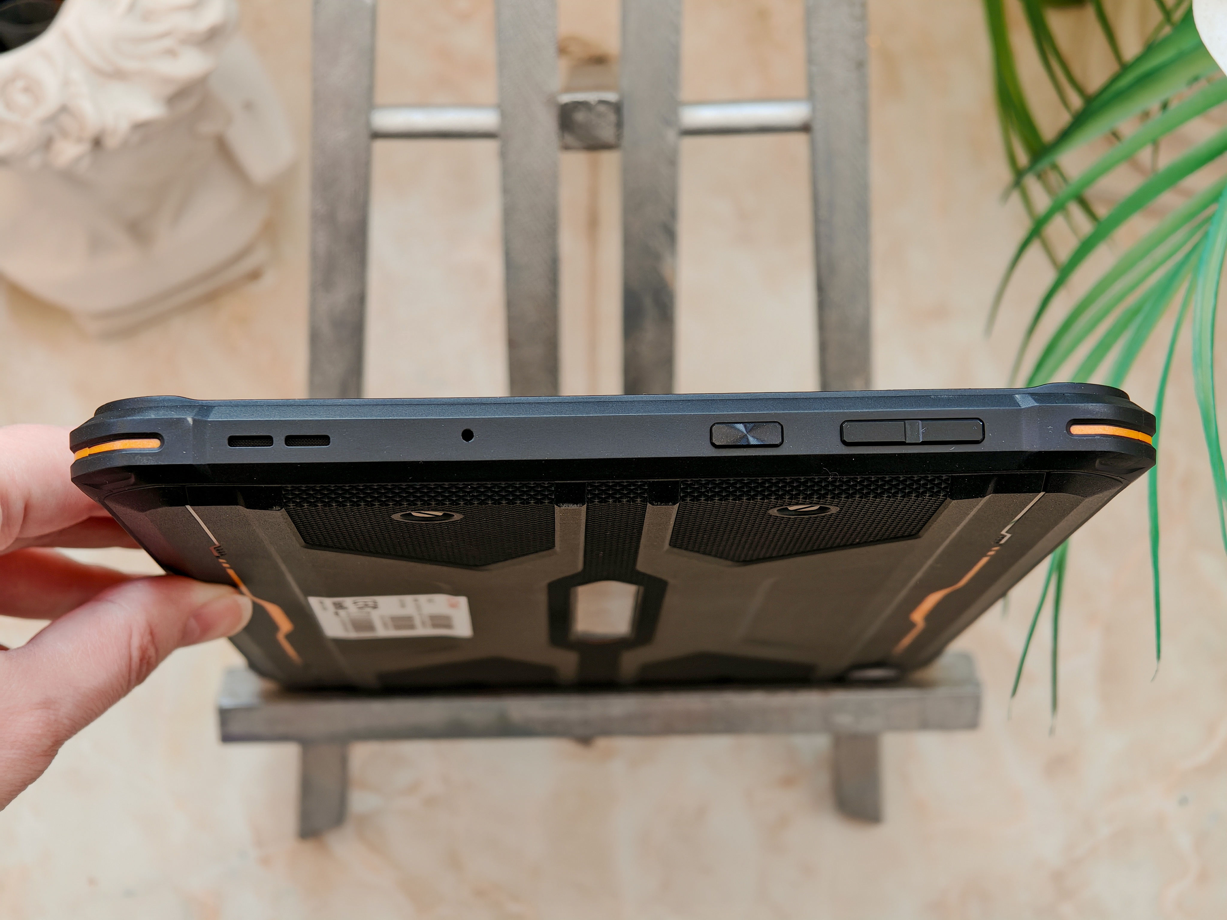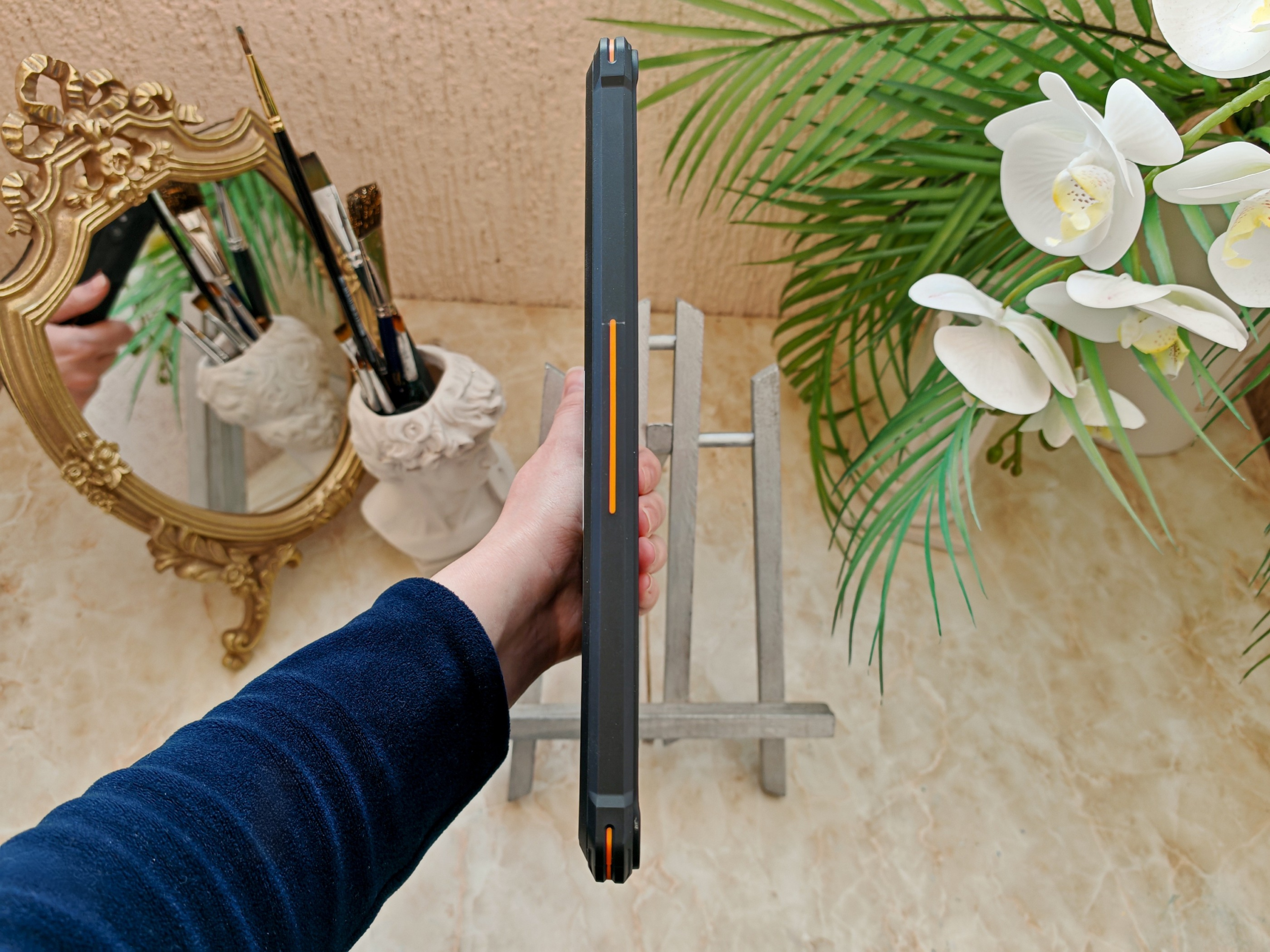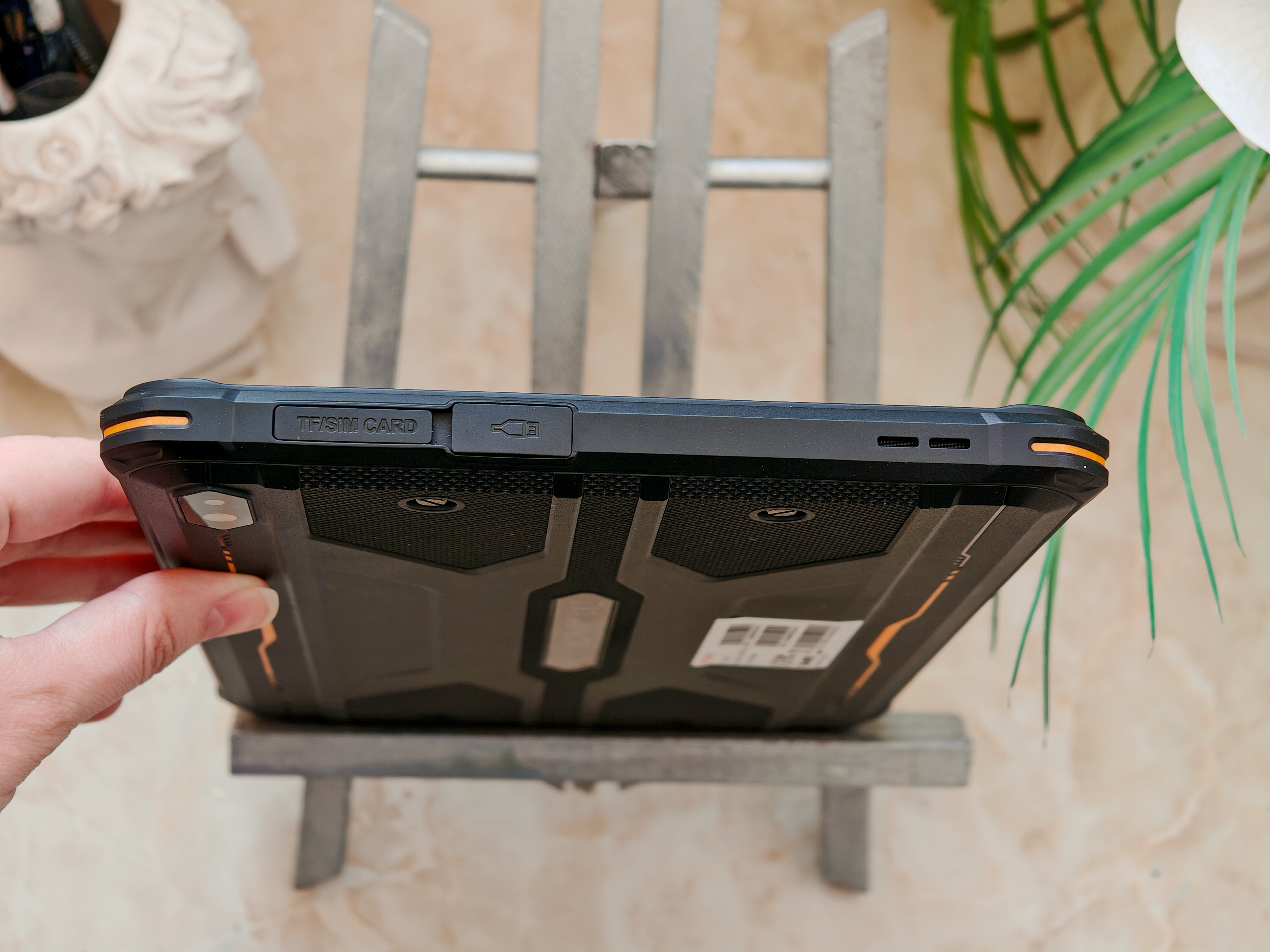 But the design of the HOTWAV R10 Pro is not so clear. The texture of the rubberized rear panel looks interesting, the installation of the holder adds originality and ergonomics to the exterior. Still, a tablet weighing almost 900 grams can be accidentally dropped from your hands, so reinsurance will definitely not be superfluous. But the only photo module does not look particularly interesting, and the front surface disappoints with huge display frames. It is difficult not to notice the impressive thickness of the device, which can be easily explained by both IP68 moisture protection and the presence of a capacious battery. The lens of the only main camera is small, neat, although its design can hardly be called attractive. As for the functional elements on the edges of the gadget, then: