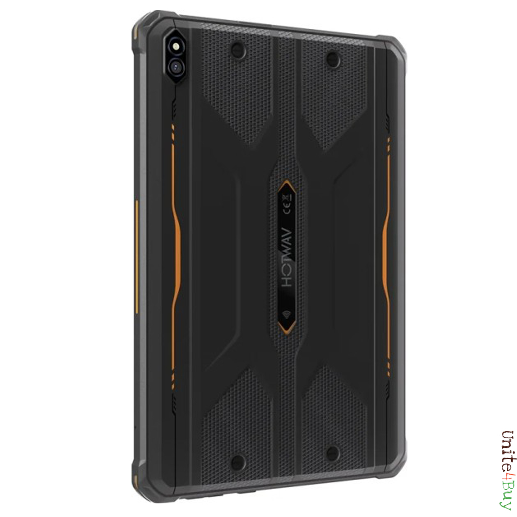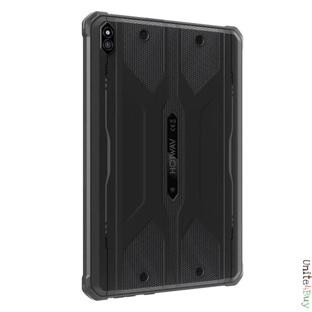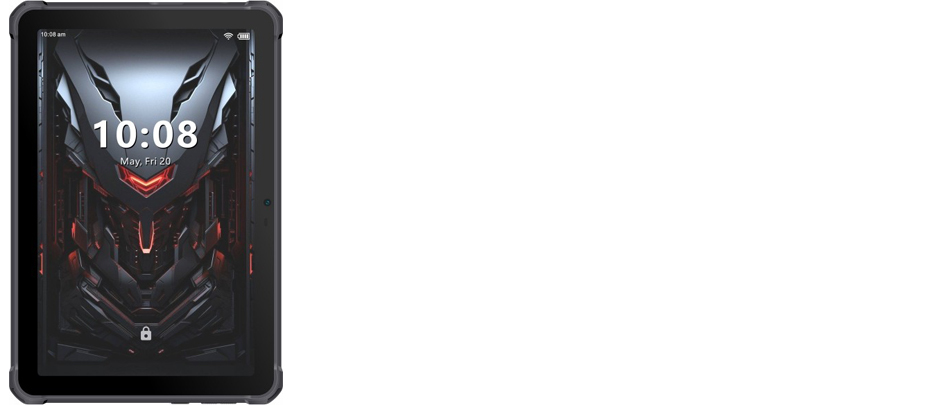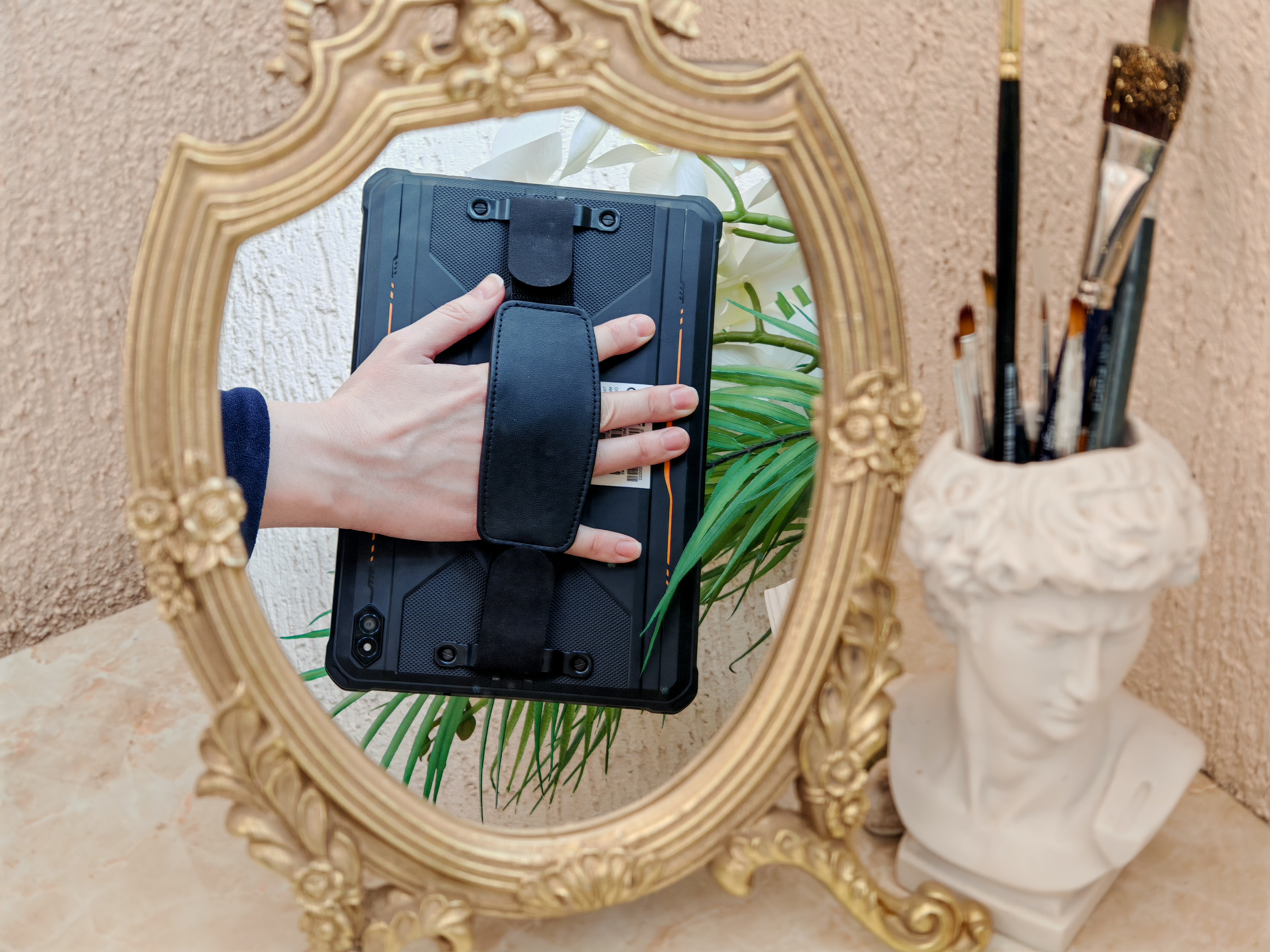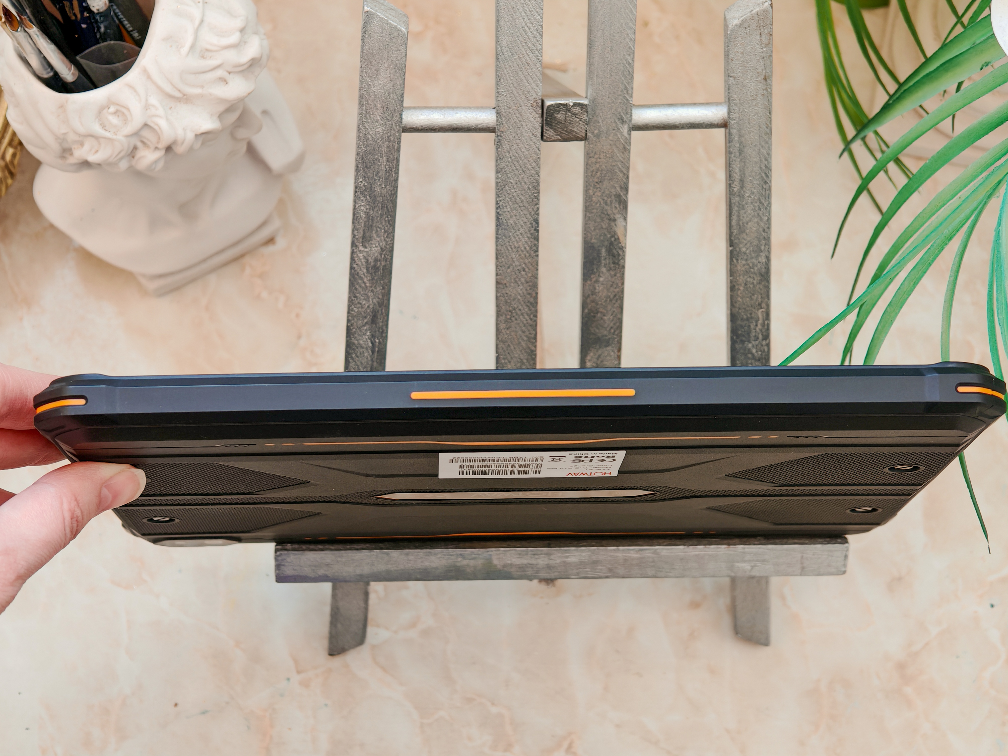 But the design of the HOTWAV R10 Pro is not so clear. The texture of the rubberized rear panel looks interesting, the installation of the holder adds originality and ergonomics to the exterior. Still, a tablet weighing almost 900 grams can be accidentally dropped from your hands, so reinsurance will definitely not be superfluous. But the only photo module does not look particularly interesting, and the front surface disappoints with huge display frames. It is difficult not to notice the impressive thickness of the device, which can be easily explained by both IP68 moisture protection and the presence of a capacious battery. The lens of the only main camera is small, neat, although its design can hardly be called attractive. As for the functional elements on the edges of the gadget, then: