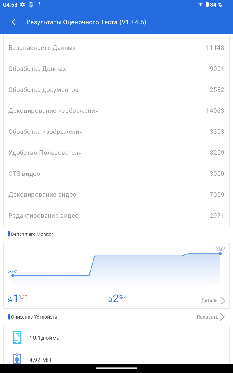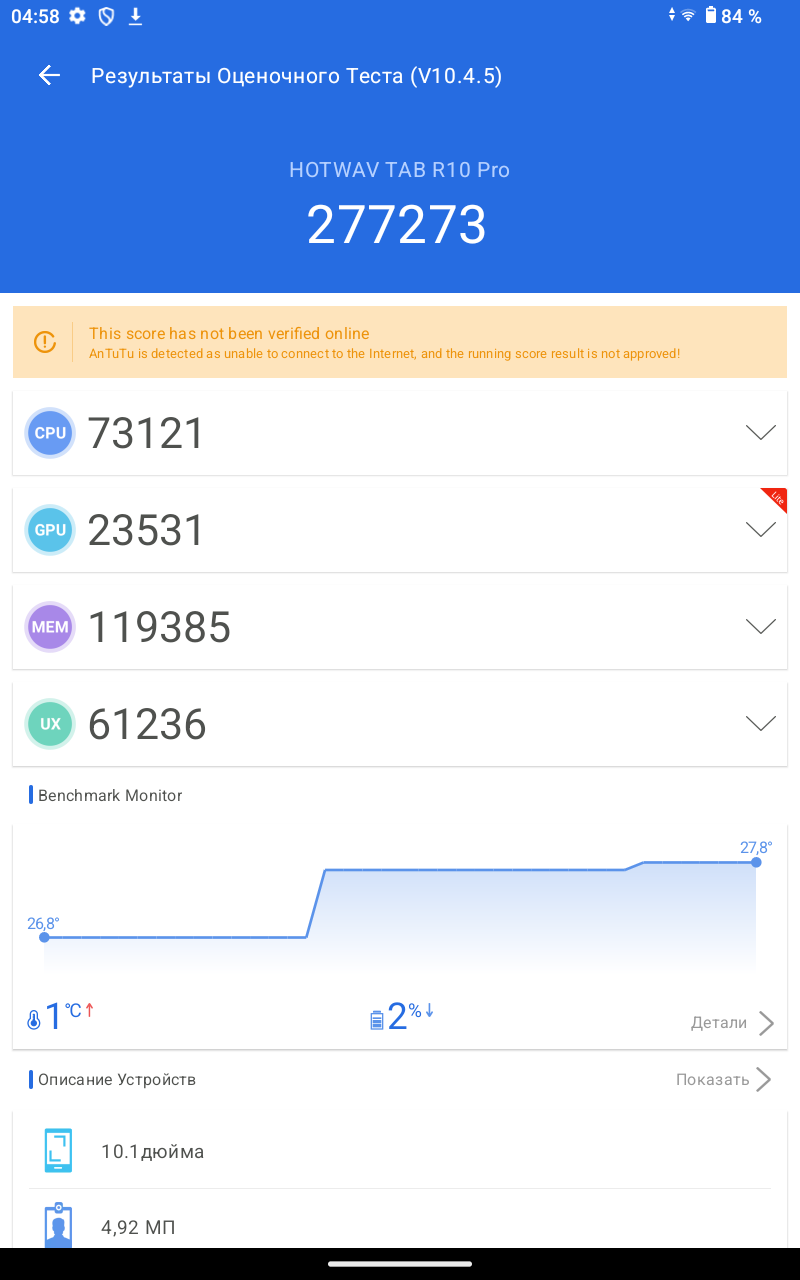 In the AnTuTu V10 benchmark, the tablet scored 277273 points, which is an average result for UNISOC Tiger T606.