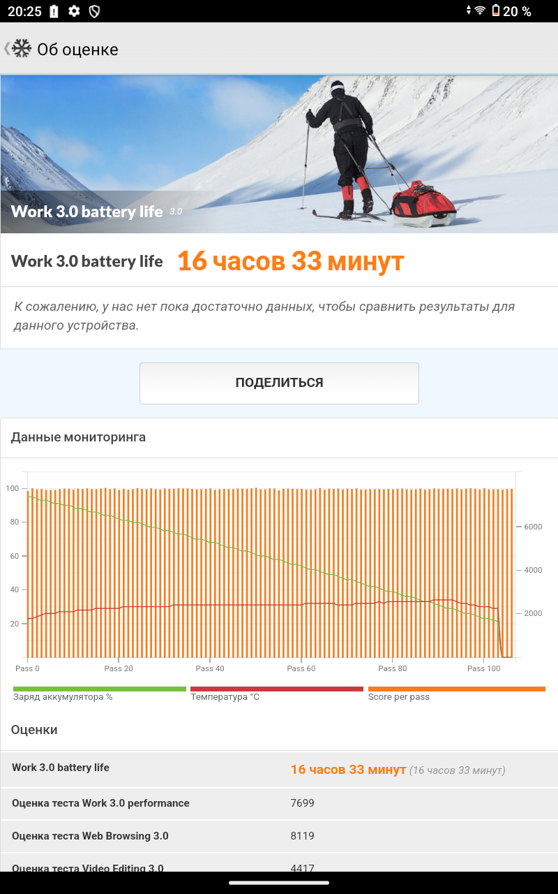 In the PCMark Work 3.0 Battery Test benchmark with 50% screen brightness and 50% volume, we get 16 hours 33 minutes, which is definitely above average.