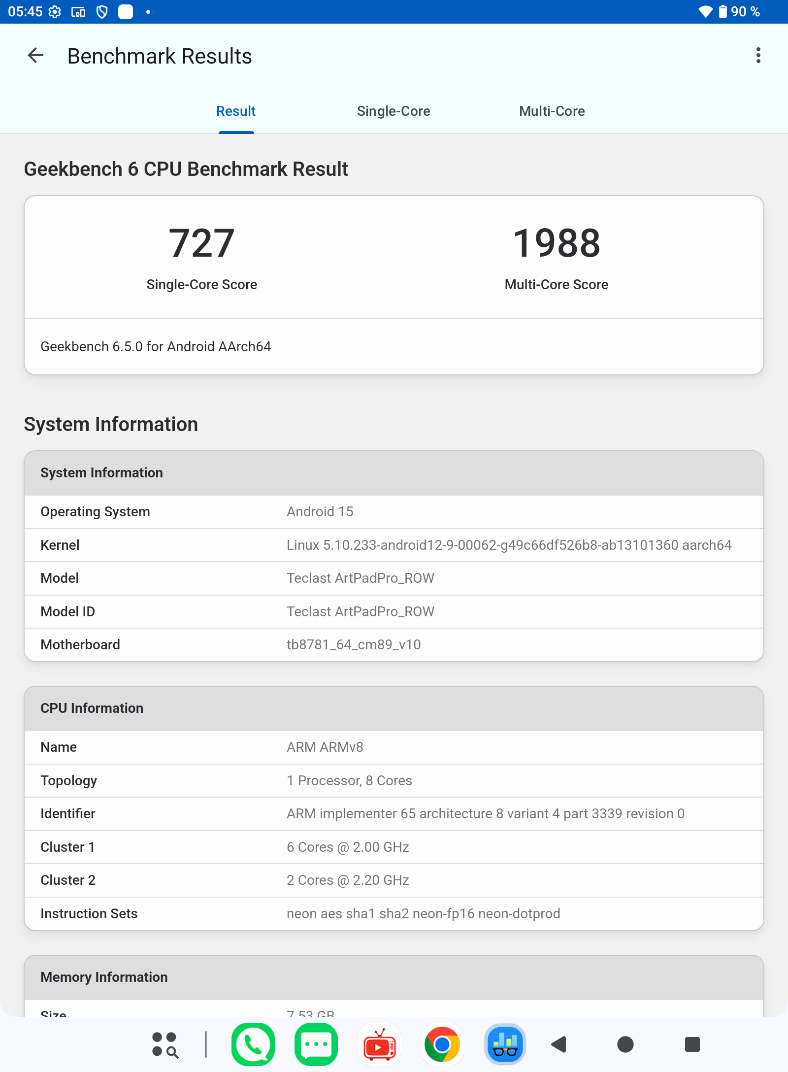 - in the GeekBench 6 benchmark, the CPU received 727 points in single-core and 1988 points in multi-core mode;
