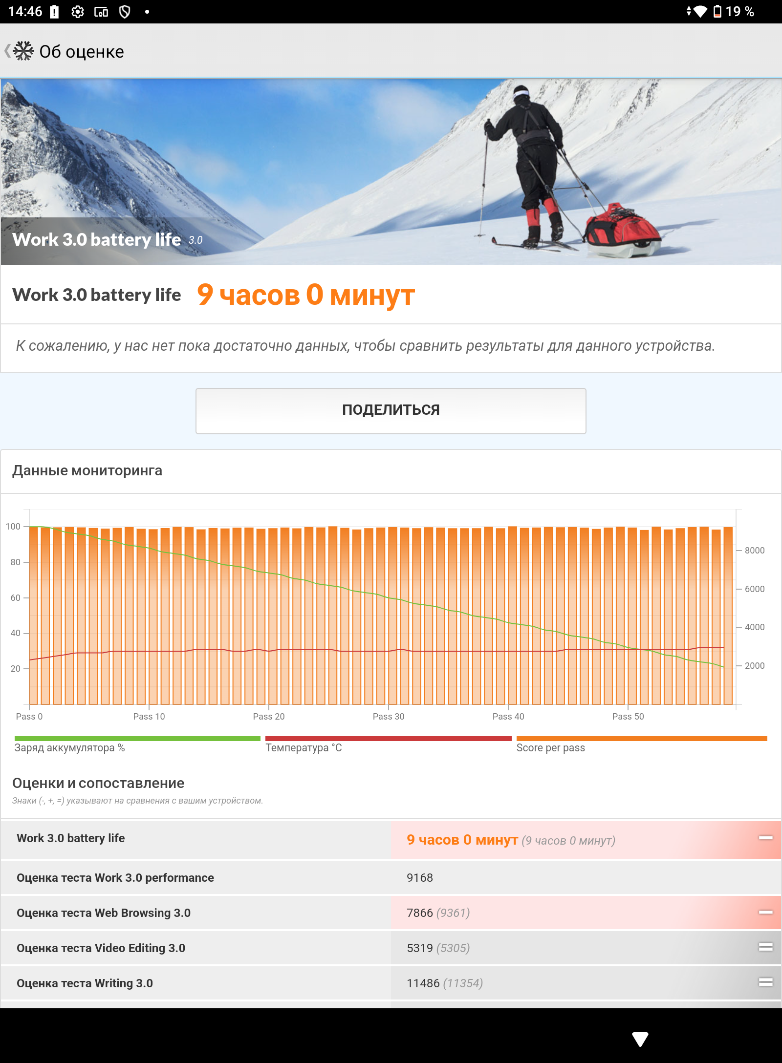 In the PCMark Work 3.0 Battery Test at about 50% brightness and 50% volume, the phone gave 9 hours of screen time. The result is not outstanding, but there are suspicions of some incompatibility between TECLAST and this benchmark, since several attempts at testing were accompanied by crashes of the application due to various errors.