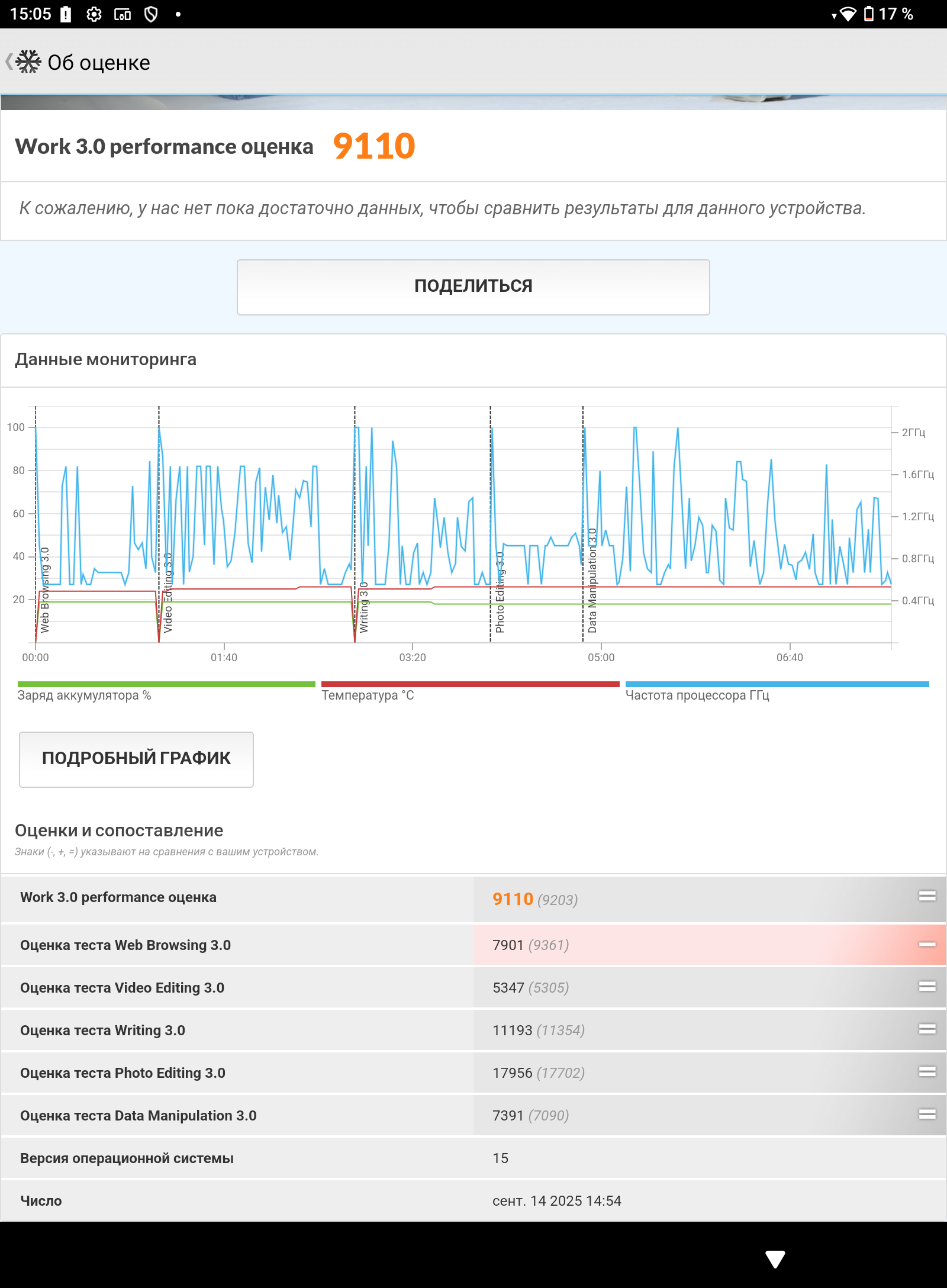 - PCMark Work 3.0 Working Test showed a result of 9110 points.