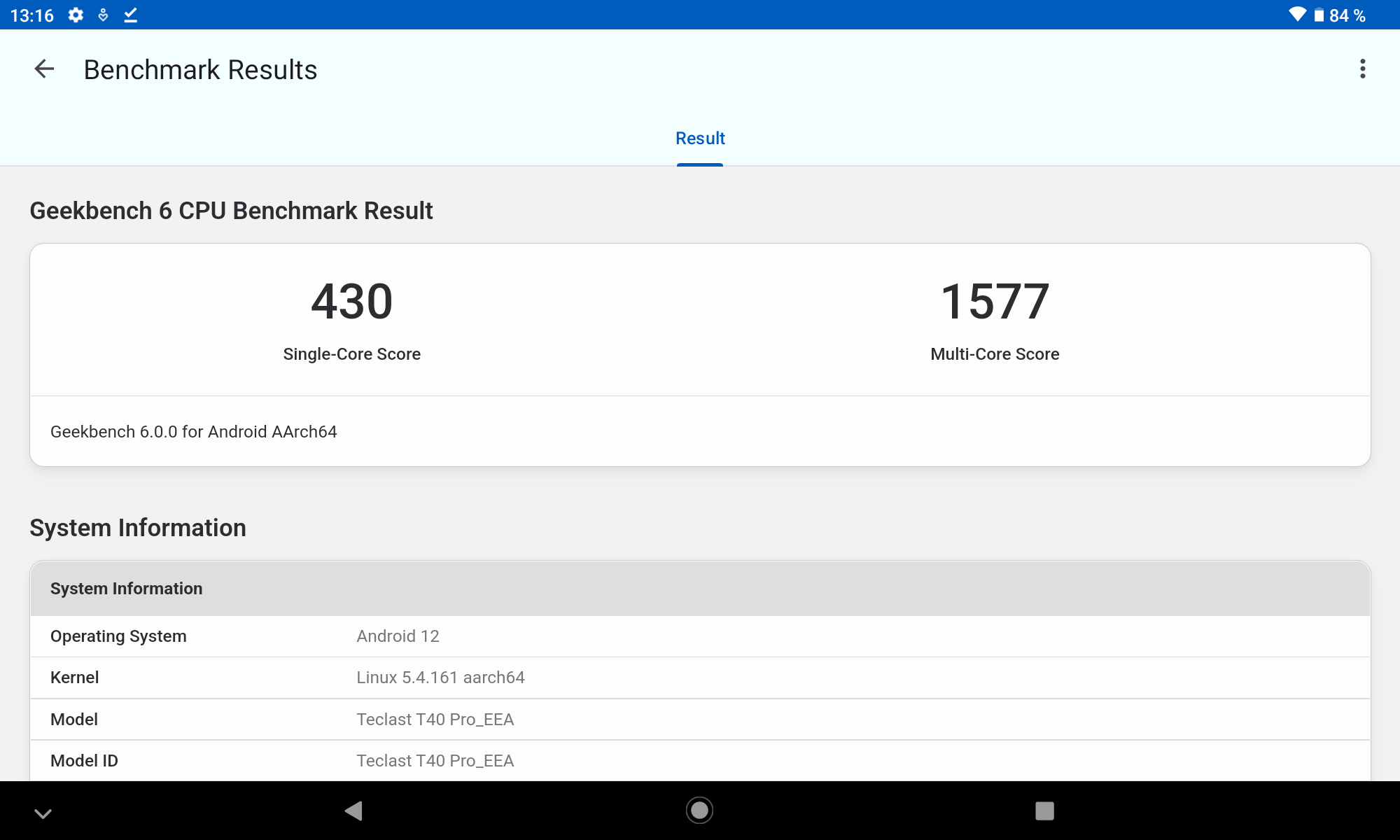 The technical characteristics were the UNISOC Tiger T616 processor, 8GB of RAM and the Mali G57MC1 graphics adapter. The CPU is equipped with two powerful ARM Cortex-A75 cores with a frequency of 2GHz and six energy-efficient ARM Cortex-A55 cores with a frequency of 1.8GHz. Let's go through the benchmarks.