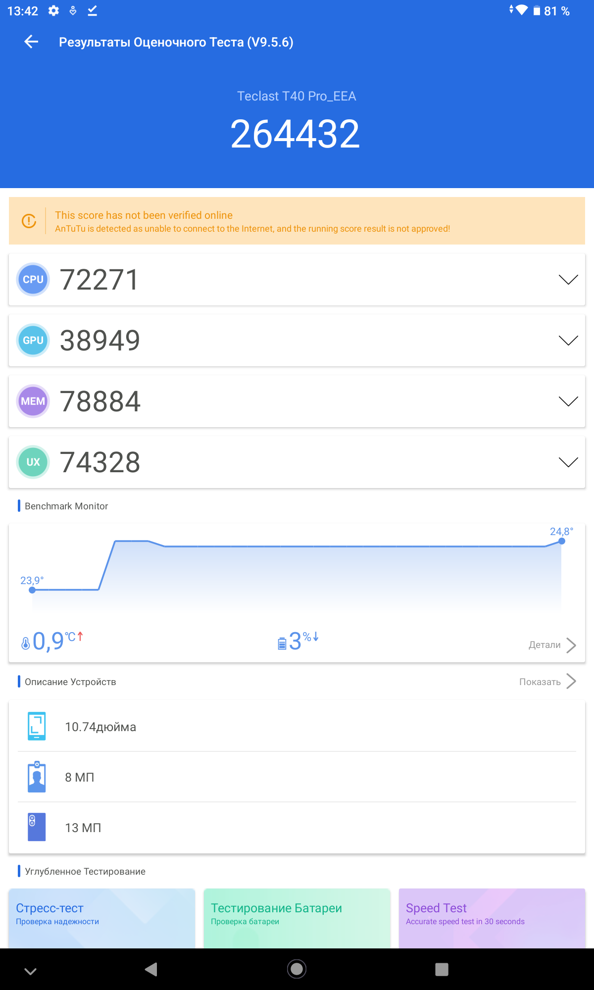 In the popular benchmark AnTuTu Benchmark v9.5.6, the gadget scores 264432 points. This is a decent result for a low-mid price tablet.