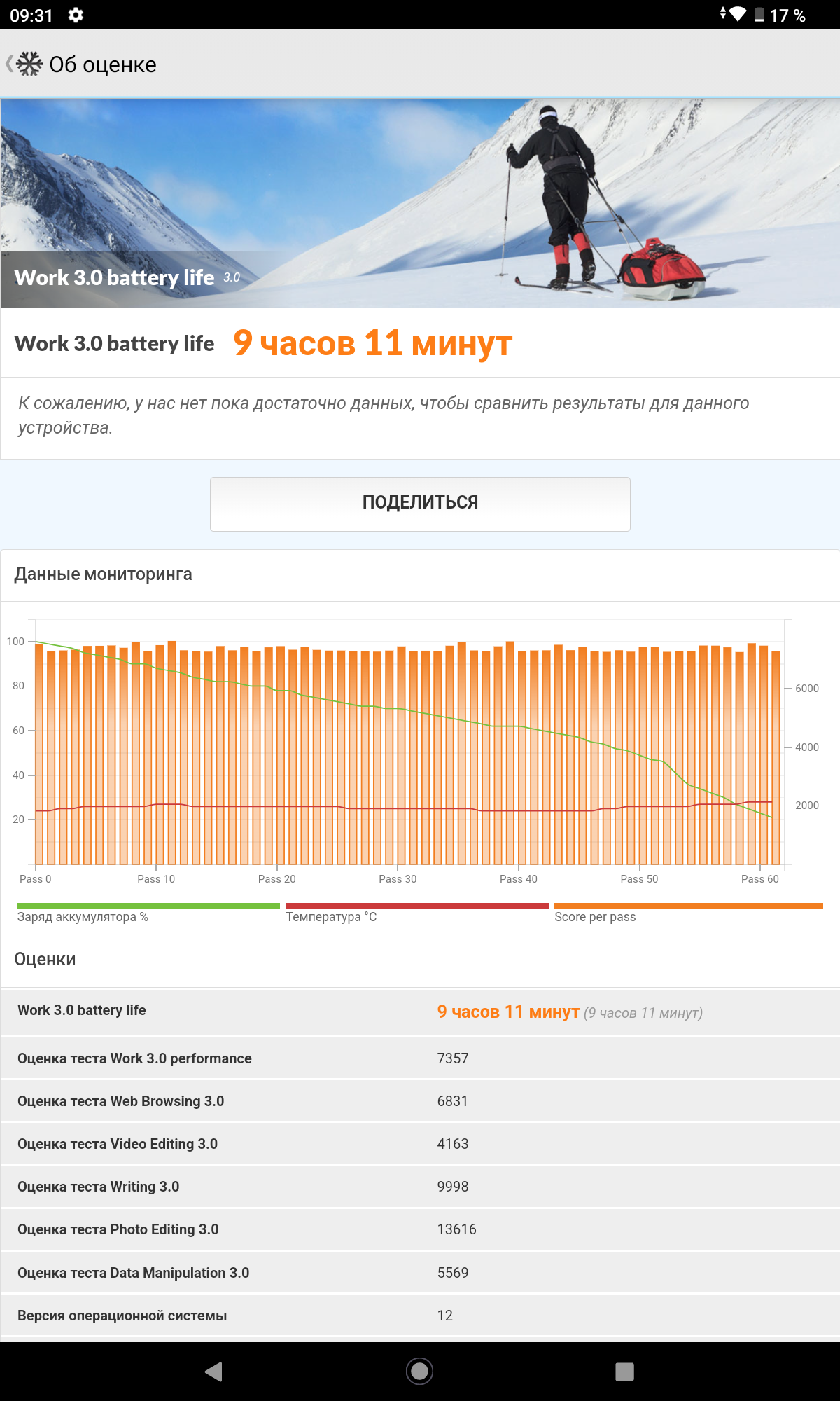 The 7000mAh battery charges from 1% to 100% in about 3 hours and 15 minutes. This is more than a good indicator for a battery of this capacity. The autonomy of the device is average, corresponds to the indicators of opponents, but does not exceed them. In resource-intensive games like Genshin Impact, PUBG Mobile can be counted on for about 4 hours of gameplay, in less demanding games (PPSSPP emulator) already for 7 hours. As for the usual mode of using the tablet, the device functions for about a day and a half with 5-5.5 hours of active screen time, which will include web surfing, watching videos, games, calls. Benchmark PCMark 3.0 Battery Test at auto-brightness gave a result of 9 hours and 11 minutes. In general, the operating time of the device from a single battery charge is not satisfactory.